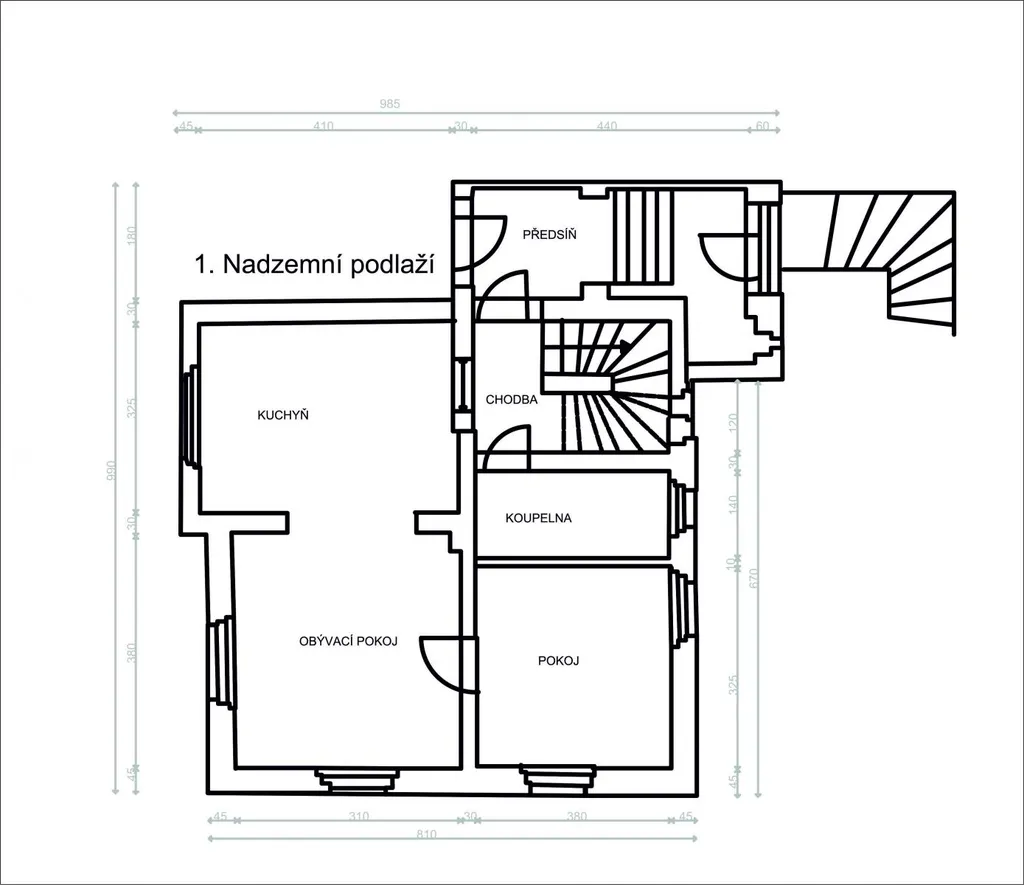 1.NP a 2. NP o celkové výměře 110 m2. Přízemí: 50 m2 + schodiště (obývací pokoj s kuchyní, ložnice, koupelna, chodba), 2. NP: 50 m2 - chodba, koupelna s vanou, dětský pokoj, ložnice, techn. místnost a šatna. Příjemná je i veranda o výměře 6 m2, kterou majitelé právě renovují.