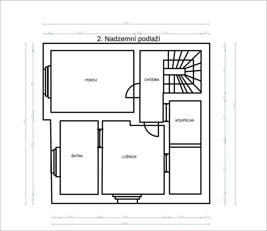 Schodištěm z chodby vystoupáte do 2. nadzemního podlaží, které Vás znovu nadchne. Zde se nachází dětský pokoj, druhá ložnice s prostornou šatnou, druhá koupelna s vanou a toaletou a technická místnost s bojlerem, sušičkou a pračkou a s úložnými prostory. Slunit se můžete také na balkoně, kam vcházíte z chodby nad schodištěm, balkon je izolovaný bez položené dlažby, zábradlí je třeba upravit do finální podoby.