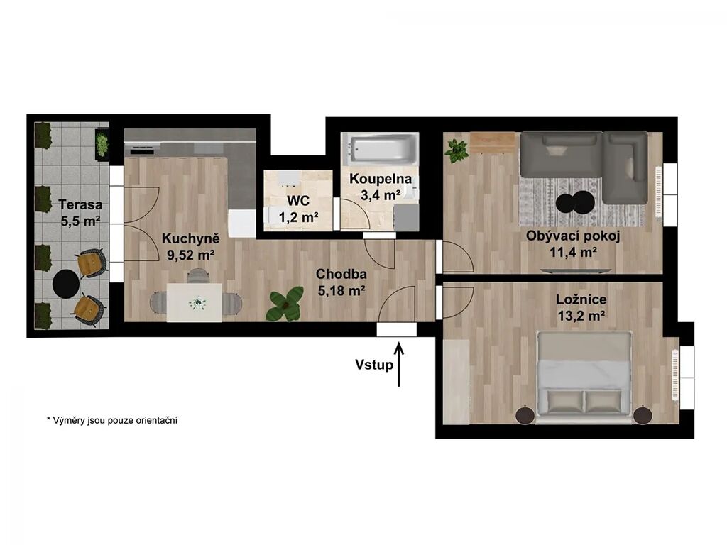 Z chodby vstoupíš do kuchyně s přístupem na terasu, koupelny s vanou, samostatného WC a dvou neprůchozích pokojů.