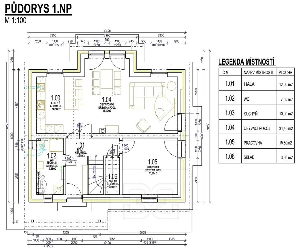 • velký obývací pokoj s přípravou na krb a místem pro kuchyňskou linku
