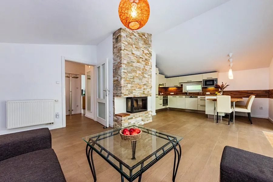Nemovitost se stává ze vstupní předsíně, prostorného obývacího pokoje s krbovými kamny a kuchyní, pokoje, ložnice, koupelny se sprchovým koutem a samostatné WC.