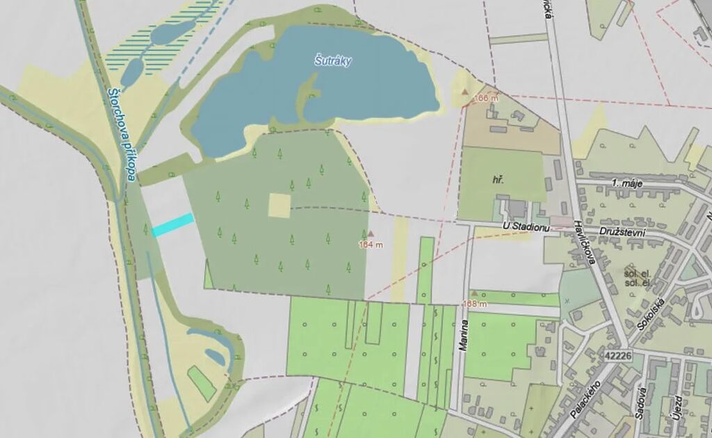 pozemek sousedí s Borovým hájem a za ním blízkým, rybáři oblíbeným rybníkem Šutráky
