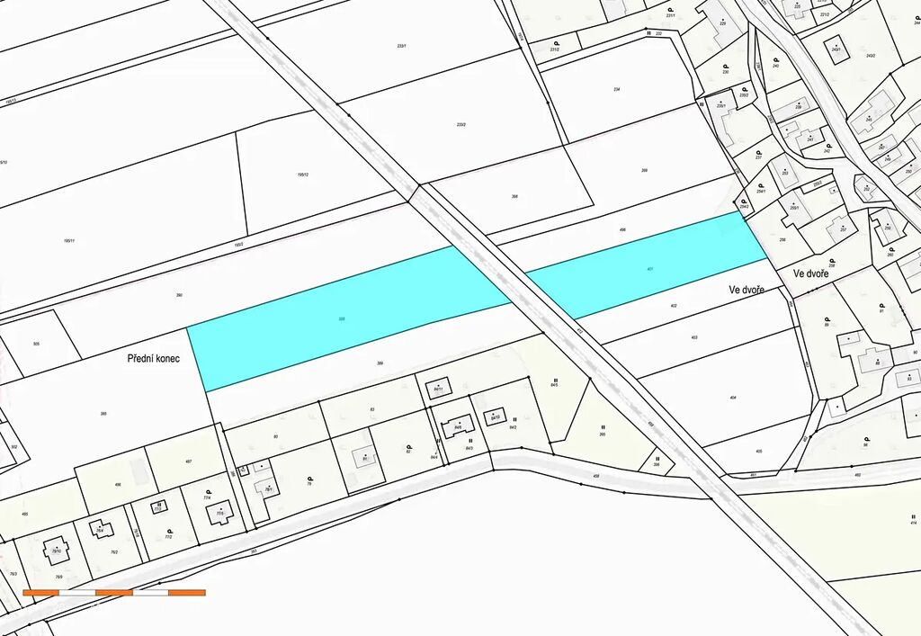 • p.č. 401 o velikosti 3570 m2 – podíl 1/6 dělá 595 m2. Parcela je přístupná po komunikaci podél kolejí ve vlastnictví státu ČR.