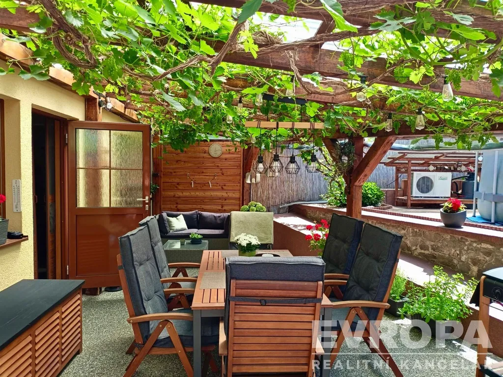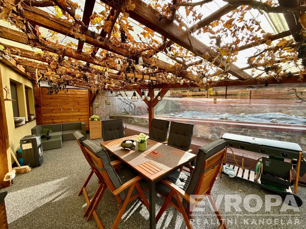 Z kuchyně vycházíte přímo na prostornou zastřešenou pergolu orientovanou na jih, která je celá obrostlá hroznovým vínem – ideální místo pro ranní kávu se zpěvem ptáků, letní grilovaní s přáteli, rodinné obědy na čerstvém vzduchu.