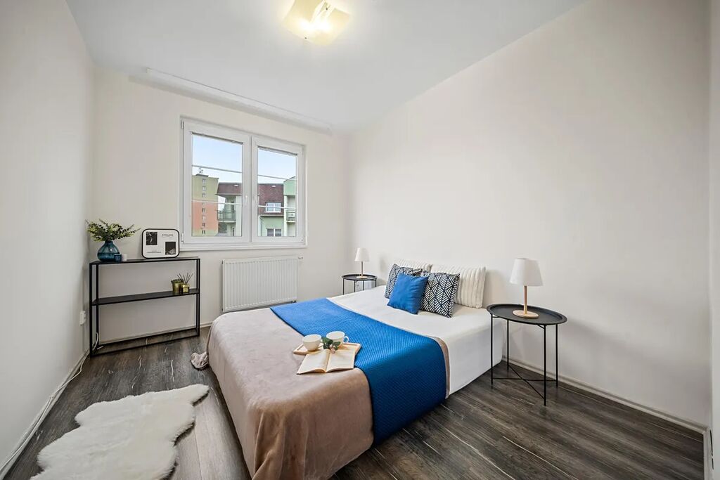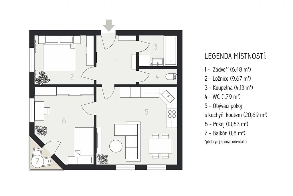 Ze zádveří vstoupíte do ložnice, obývacího pokoje s kuchyňským koutem, koupelny s vanou a samostatného WC. Z obývacího pokoje je přístup do dalšího pokoje, který má vlastní balkon.