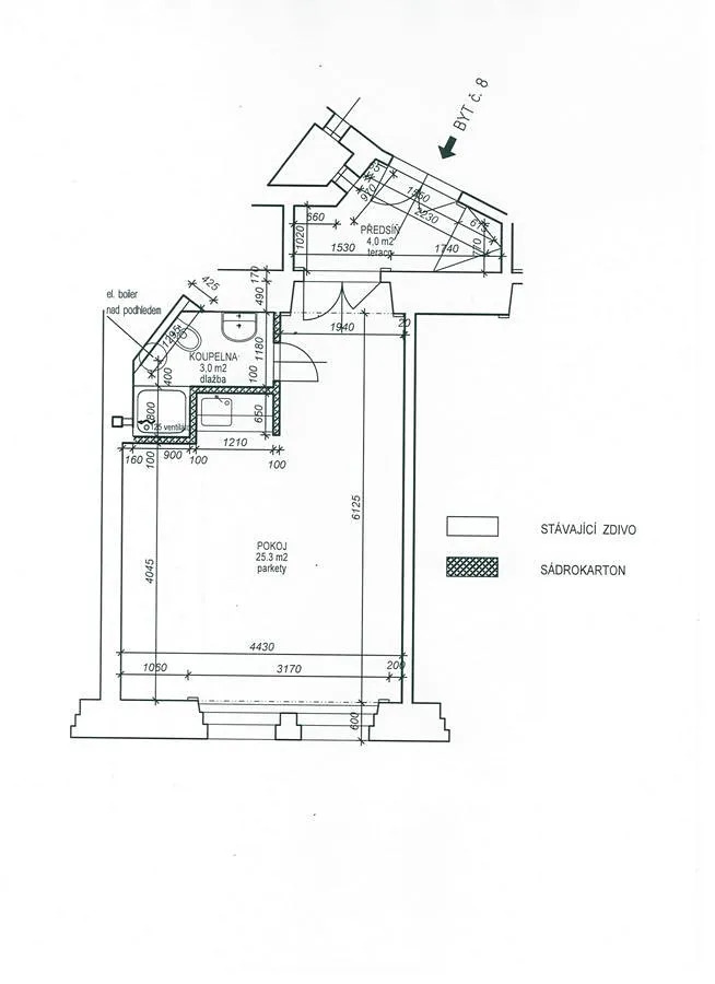 Byt má velká okna a tím dostatek světla, je vybaven kuch. koutem s dvouvařičem a lednicí. Koupelna je se sprchovým koutem společná s WC. Vytápění je elektrické.