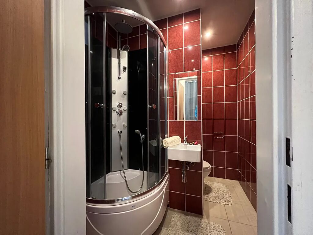 Koupelna se sprchovým koutem, toaleta je součástí koupelny, oddělená příčkou.