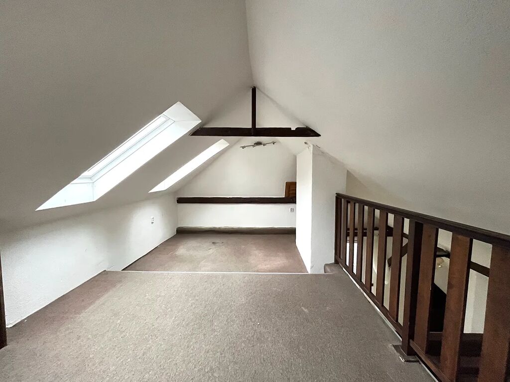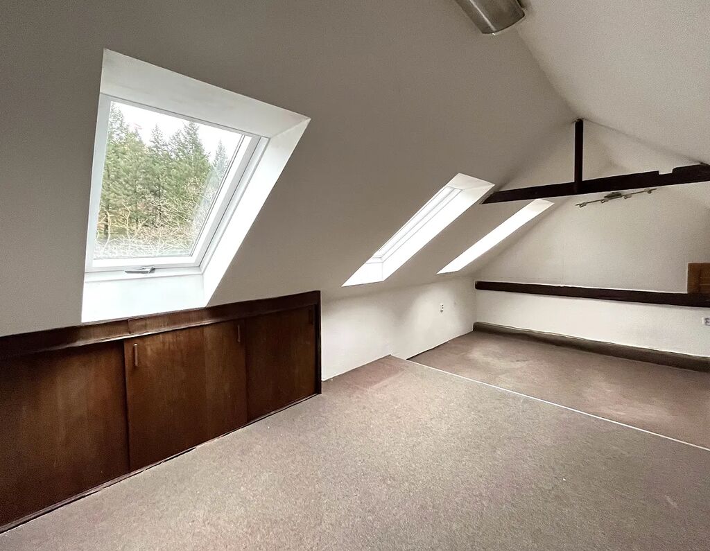 Menší samostatný pokoj(cca12m2) je vedle kuchyně, z obývacího pokoje (cca 25m2)je přístup po schodech do otevřeného podkroví. (cca 15m2).Oba spodní pokoje mají vstup na terasu.