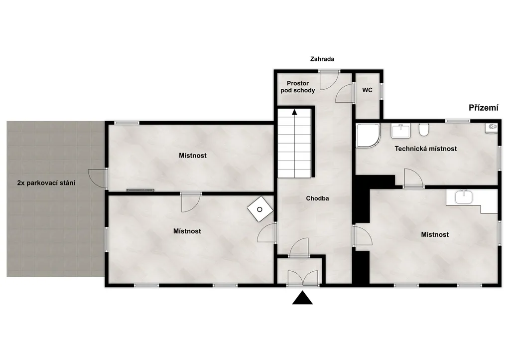 V přízemí se nacházejí tři místnosti a technická místnost, což umožňuje široké využití prostoru, ať k podnikání nebo bydlení. V technické místnosti je i sprchový kout. V jedné z místnosti se nacházejí kachlová kamna a v další je možnost mít menší kuchyňskou linku, ideální místo například pro ordinaci.