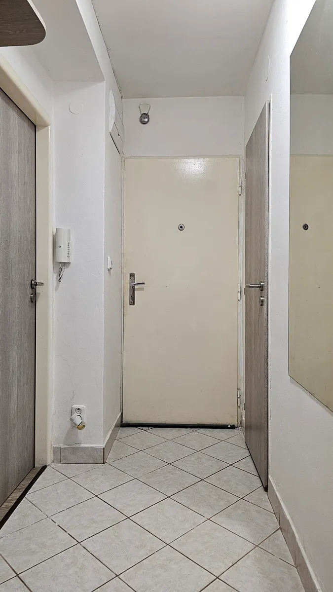 Dispozice zahrnuje vstupní chodbu, ložnici, dětský pokoj, kuchyň s obývacím koutem, koupelnu a samostatné WC.