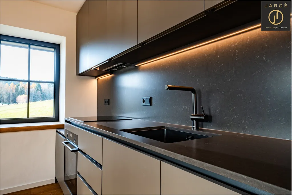 Dispozice zahrnuje prostorný obývací pokoj s kuchyňským koutem, dvě velké ložnice, koupelnu, samostatné WC a širokou vstupní halu. Díky otevřenému řešení obytné části je apartmán vhodný jak pro rodinné rekreační pobyty, tak pro prémiové krátkodobé pronájmy. Možnost vybudování vlastní sauny navíc dodává bytu výjimečný potenciál, který u horských projektů nebývá samozřejmostí.
