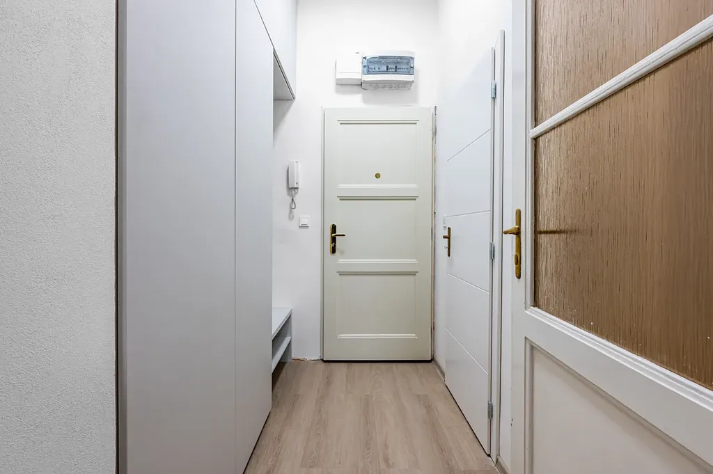 Interiér bytu byl navržen s důrazem na praktičnost i moderní estetiku. Součástí je nová kuchyňská linka vybavená indukční varnou deskou, digestoří a pračkou, doplněná o novou volně stojící lednici. Praktické uspořádání zajišťuje dostatek prostoru pro vaření i každodenní provoz. Velkým benefitem je také zcela nová koupelna se sprchovým koutem – prostorná, v elegantním moderním stylu a připravená k okamžitému užívání.
