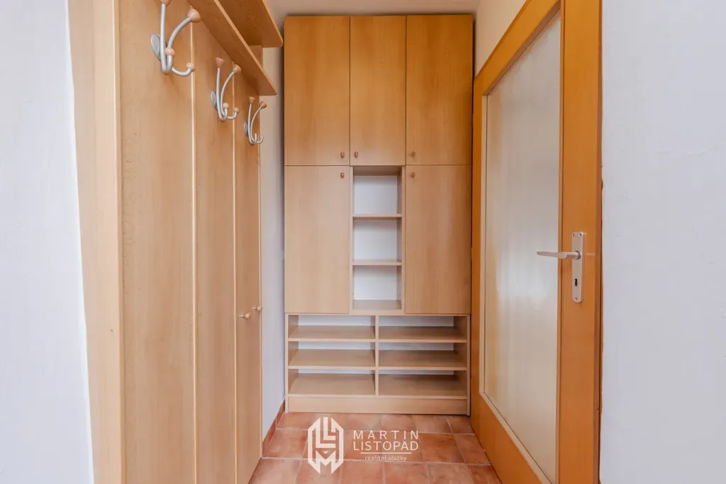 Interiér tvoří vstupní chodba, průchozí obývací pokoj, kuchyně s jídelním koutem, ložnice a koupelna se sprchovým koutem a toaletou. Byt prošel kompletní rekonstrukcí v roce 2005(nové rozvody elektro, plyn, voda, PVC okna) a je ve velmi dobrém, udržovaném stavu.