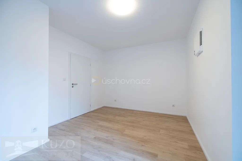 V bytě je podlahové vytápění, elegantní vinylové podlahy, rekuperace v pobytových místnostech a velkoformátová okna s trojskly.