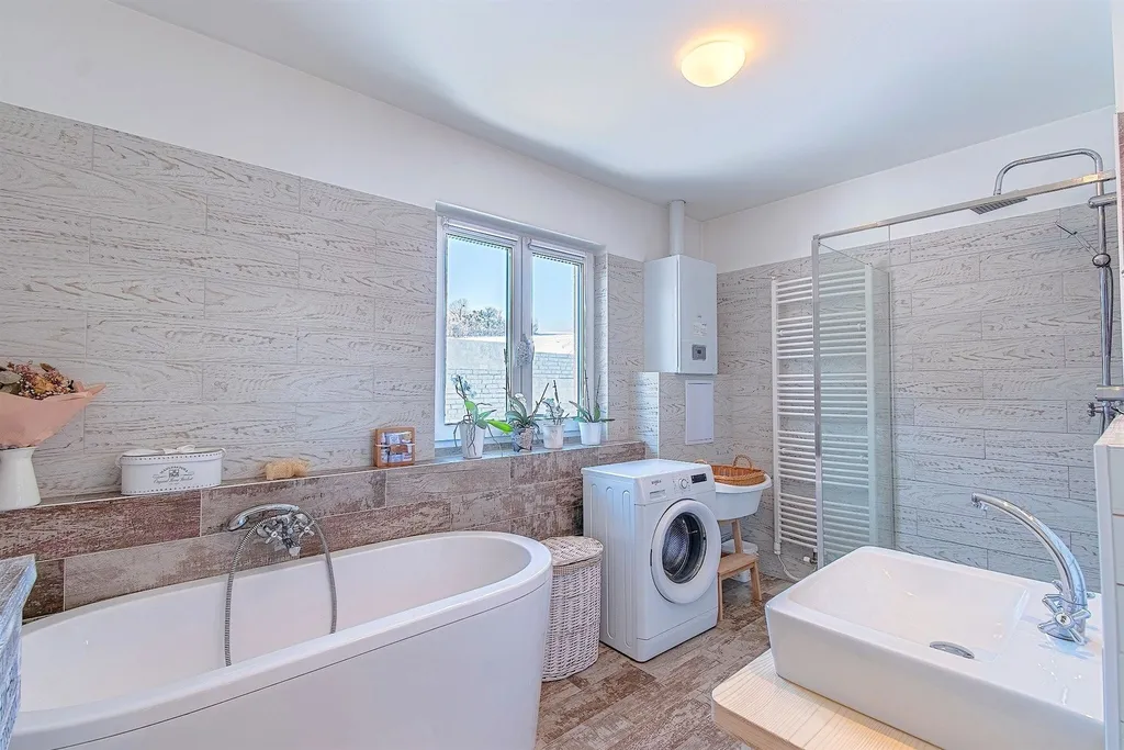Vytápění je ústřední podlahové (systém Rehau) ve všech místnostech, ohřev vody do podlahy i pro ÚV zajišťuje plynový kondenzační kotel zn. Baxi. Dále je možné vytápění tuhými palivy v obýváku se nachází krbová kamna, která bez problémů vytopí za okamžik celý dům. Dům je energeticky úsporný, energ. náročnost budovy třídy "B". Kompletní stavební dokumentace k dispozici, bude předána s domem novému majiteli.