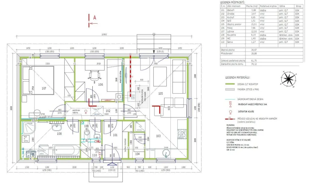Dům je dřevostavbou systému NovaTOP, je koncipován jako rostoucí, možnost rozšíření v případě potřeby. Okna jsou plastová trojskla, podlahy dřevo + dlažby. Střecha valbová, krytina plechová, stropy zateplené.