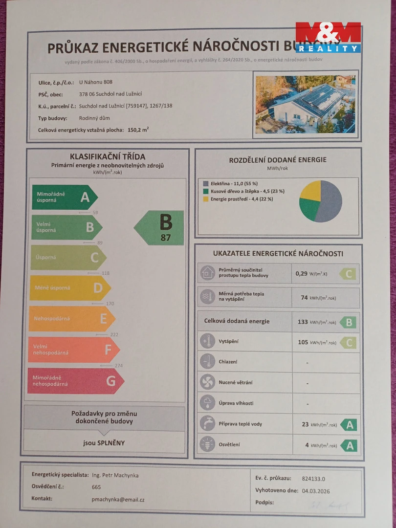 Prodej novostavby RD v Suchdole nad Lužnicí. Dům byl zkolaudován v roce 2019 a nachází se v klidné části. města. Velikostně je to 4 + kk o podlahové ploše 114 m2 s dvěma koupelnami, garáží a zasklenou terasou (10 m2). Na střeše je 25 solárních panelů, které slouží k podlahovému vytápění (21 ks) a ohřevu vody (4 ks). Díky úložným a virtuálním bateriím jsou nízké náklady na bydlení. Roční provozní náklady pro 2 osoby jsou 35.353,- Kč, což je celkem 2.946,- Kč za měsíc. V obývacím pokoji se nachází krbová kamna, která vytopí celý objekt. PENB je třídy B. Střecha je z vazníků a střešních tašek BRAMAC. Na pozemku se nachází malý zahradní domek. Zahrada je velmi dobře udržovaná a nachází se zde i několik ovocných stromů. Celková plocha pozemku činí 773 m², užitná plocha domu je 123 m².Veškeré vybavení RD je součástí kupní ceny. V Suchdole nad Lužnicí je veškerá občanská vybavenost. Ideální místo pro cykloturistiku, houbaření, koupání v blízkých pískovnách, rybaření. Doporučuji prohlídku
