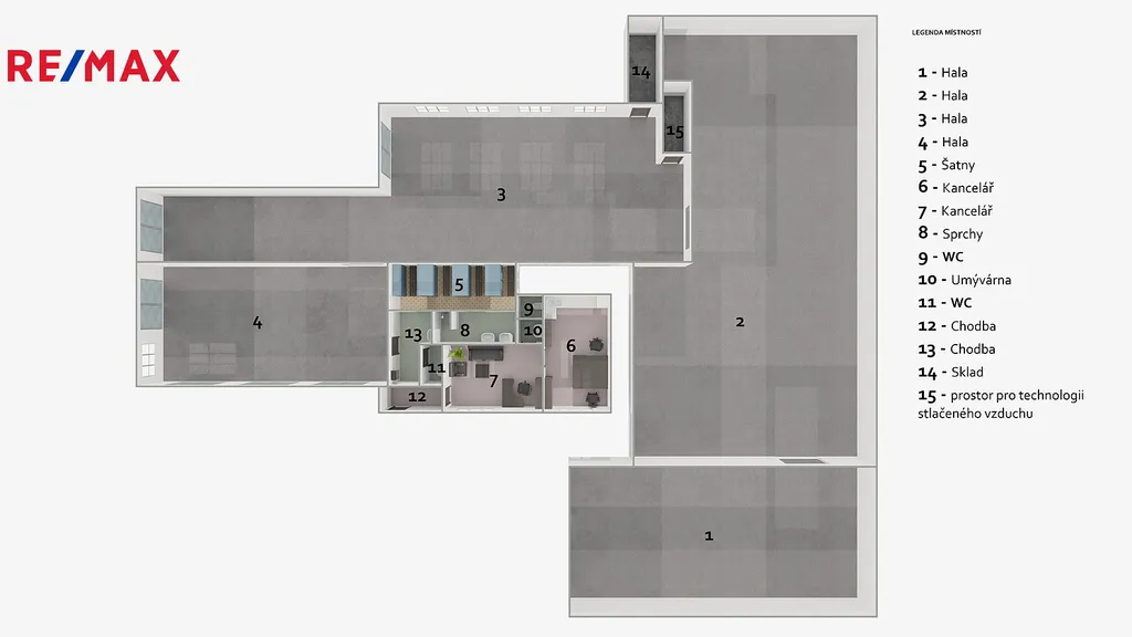 Dispozice: 4 propojené haly (2 zděné, 2 montované – ocelová konstrukce)