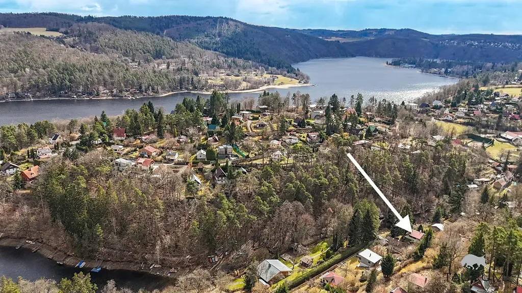 Chata je na opravdu velmi pěkném místě na východním břehu přehrady jen pár metrů od vody v klidné chatové oblasti se vzrostlými stromy. Z okraje Prahy je dostupná cca za 30 minut autem a dojet je možné až přímo na pozemek chaty. Parkování je tedy možné jak na pozemku, tak i před pozemkem, protože součástí prodeje je nejen samotná chata s vlastní oplocenou zahradou o celkové ploše pozemku 591 m2, ale i podíl na pozemku před chatou, ze kterého vede pěší přístup k vodě.