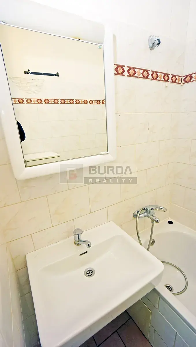 V koupelně je vana, umyvadlo, zrcadlo a skříňka. Koupelnou prochází silná stoupačka vytápění a krásně koupelnu prohřeje.