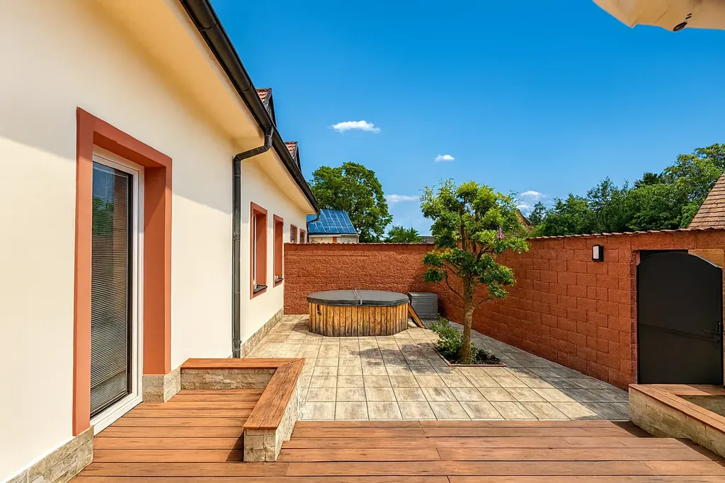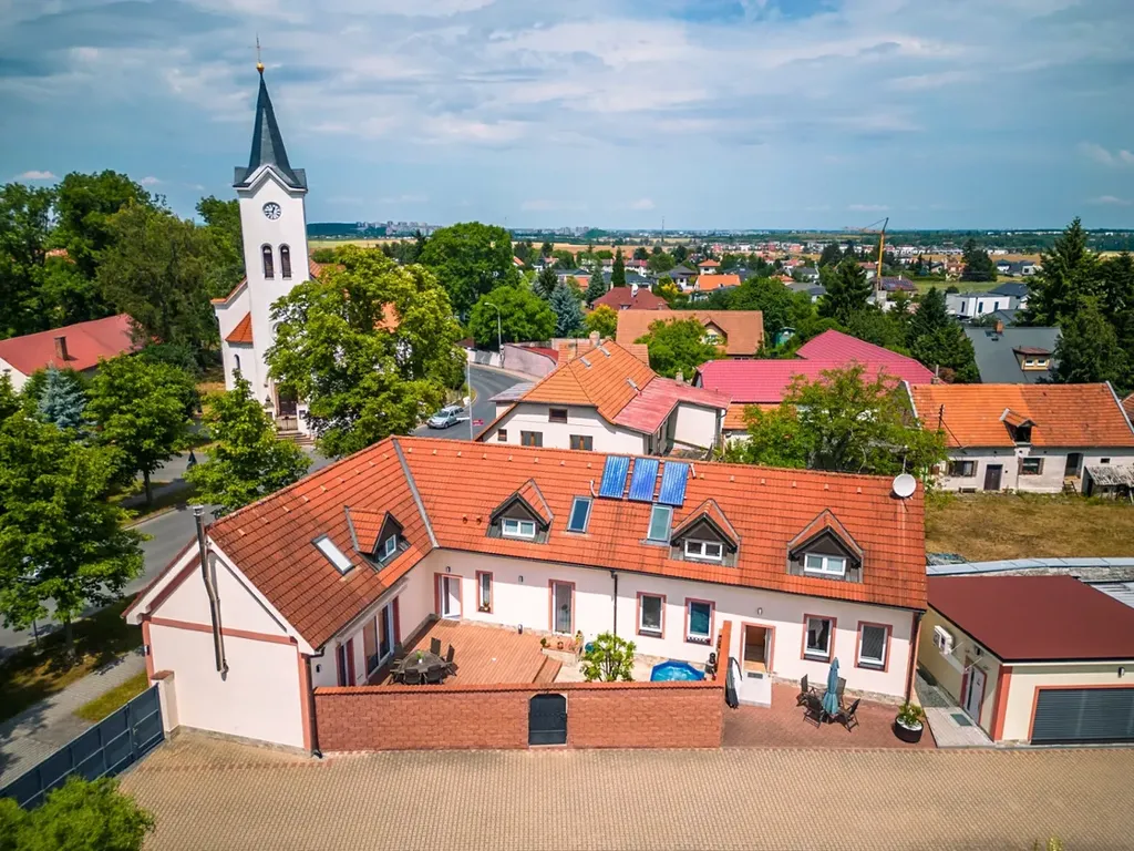 Obytná část budovy má 192 m² a současná dispozice je 4+1. Může sloužit jako pohodlné bydlení, ale stejně tak i jako kanceláře, klientské prostory nebo samostatné ubytování. Vše se nachází v příjemném, uzavřeném prostředí, kde nechybí soukromá část s terasou, vířivkou, zelení a technickým zázemím. Vytápění zajišťuje tepelné čerpadlo a solární panely, alternativou je elektrokotel a klimatizace. Dům je připojen na obecní vodu a kanalizaci, ale k dispozici jsou i dvě vlastní studny pro užitkovou vodu, zavlažování a údržbu. Samostatné měření energií a důraz na úsporný provoz jsou samozřejmostí.