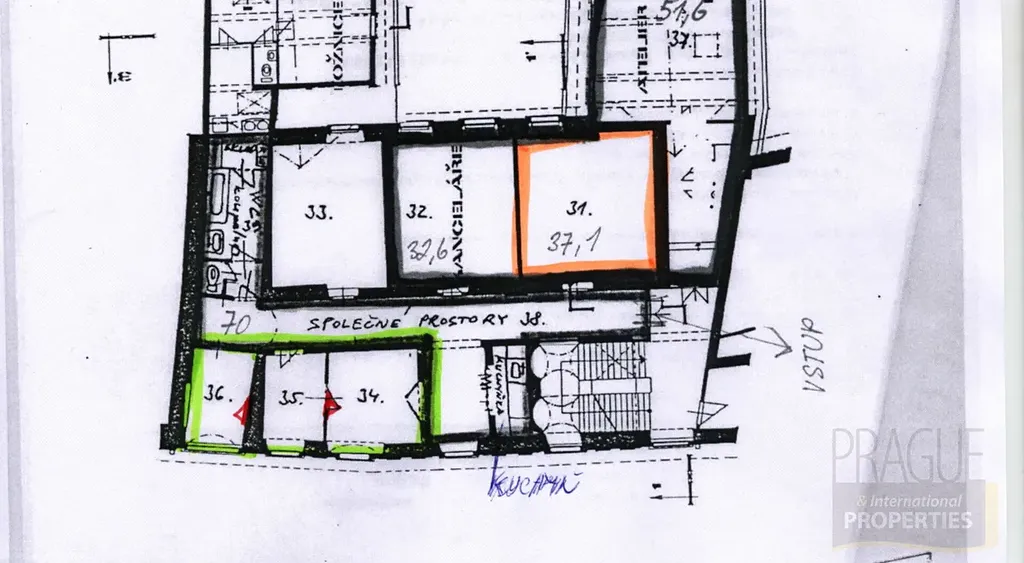 Pronájem reprezentativní kanceláře v samém srdci Prahy, jen pár kroků od Staroměstského náměstí. Melantrichova 970. Kancelář se nachází ve 3. patře historického domu a nabízí 35m2 plochy. Prostory jsou dispozičně řešeny jako 3 jednotlivé malé kanceláře, které mají samostatný vstup ale jsou i průchozí. Součástí je sdílená kuchyně, toalety. Středem vede chodba. Prostory jsou zabezpečeny alarmem, podlahy parketové. Poloha poskytuje výbornou dopravní dostupnost - stanice metra Můstek, Staroměstská i blízkost mnoha obchodů a restaurací.