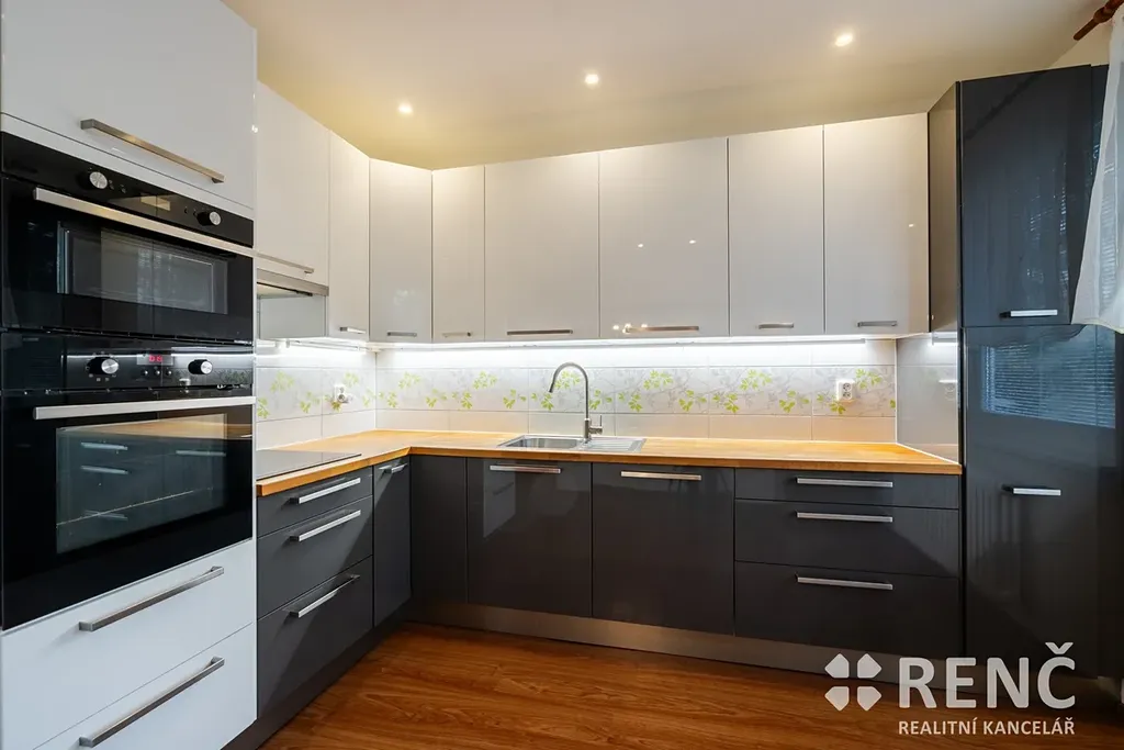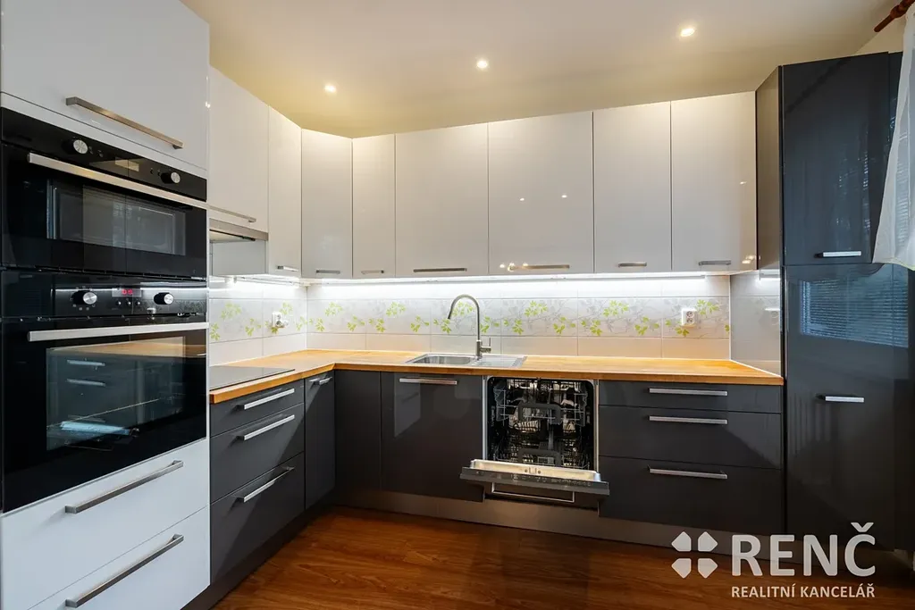 Kuchyně je vybavena moderní kuchyňskou linkou zn. Ikea s elektrickou varnou deskou, elektrickou troubou, mikrovlnnou troubou, myčkou, spížní skříní a lednicí s mrazákem. V předsíni jsou instalovány dvě prostorné vestavěné šatní skříně a botník.