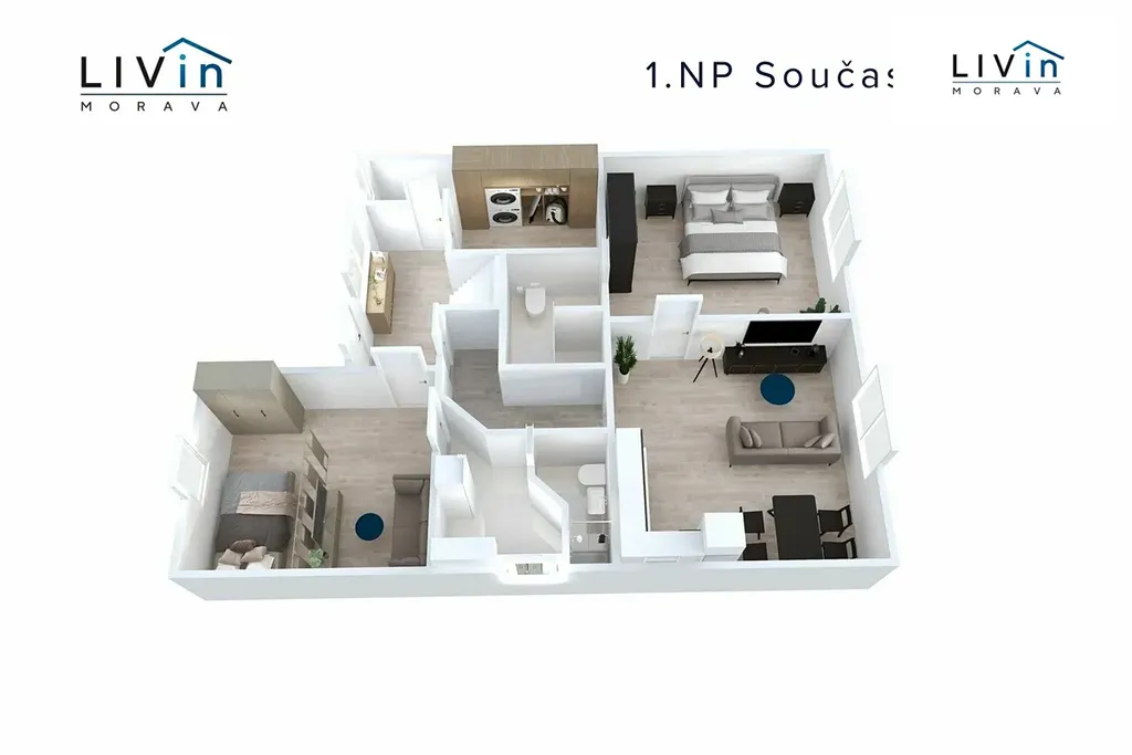 První nadzemní podlaží je v současnosti rozděleno na dva samostatné byty, přičemž jednoduchým odstraněním sádrokartonové příčky lze dispozici vrátit do původní podoby se třemi obytnými místnostmi, kuchyní a dvěma komorami/šatnami - vizualizace viz půdorys. Byt 2+kk o užitné ploše 50 m² tvoří předsíň, koupelna se sprchovým koutem a dvě obytné místnosti (jedna s kuchyňským koutem). Byt 1+1 o užitné ploše 23 m² zahrnuje obývací pokoj, kuchyň a koupelnu se sprchovým koutem.