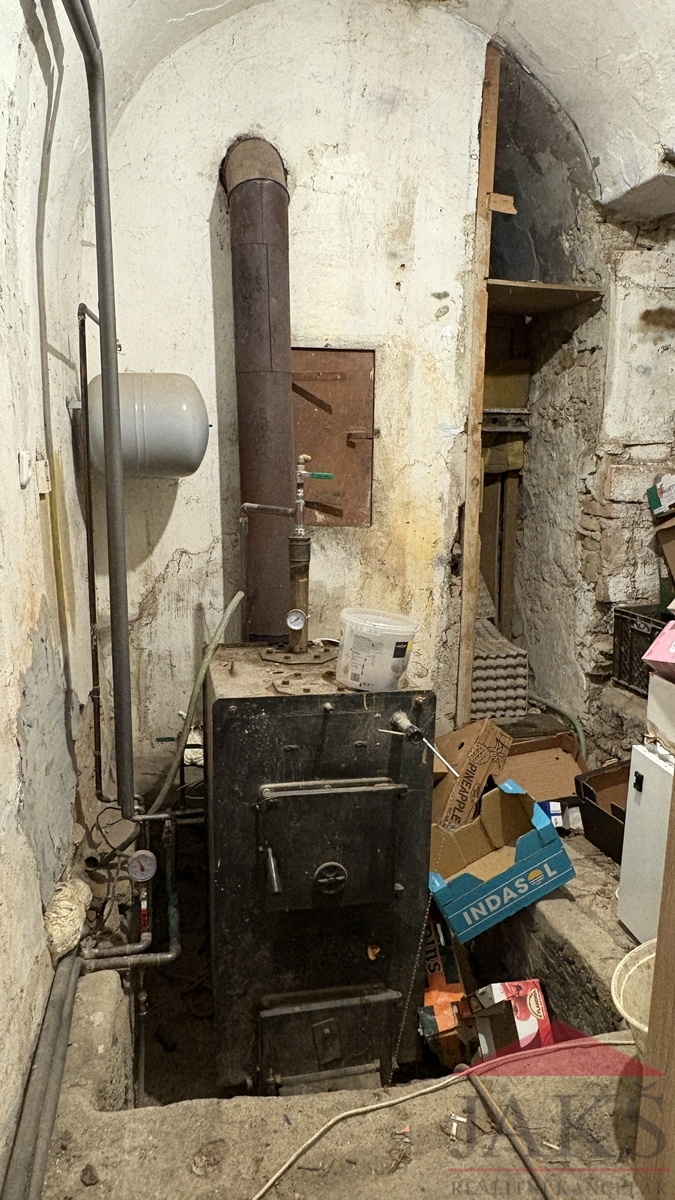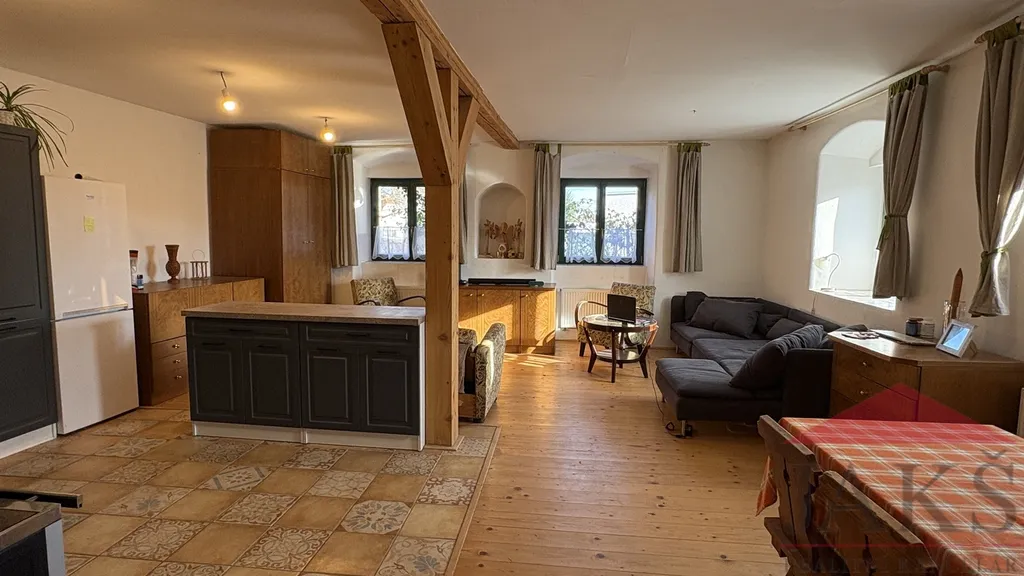 Popis: vstup skrze zastřešenou dřevěnou verandu s posezením; 1.NP: předsíň se schodištěm do 2.NP, komora, sam. WC, stylová koupelna (vana, umyv. se zrcadlem a skříňkou, topný žebřík), prostorný obývací pokoj 40 m2 s dřevěnou podlahou, jídelnou, kuch. koutem (stylová rohová kuch. linka s HV troubou, plynovými hořáky) a sporákem na T.P. s výměníkem, ložnice; 2.NP: podesta, prostorný pokoj 40 m2 s původní zbroušenou dřevěnou podlahou, nedokončená ložnice a koupelna.