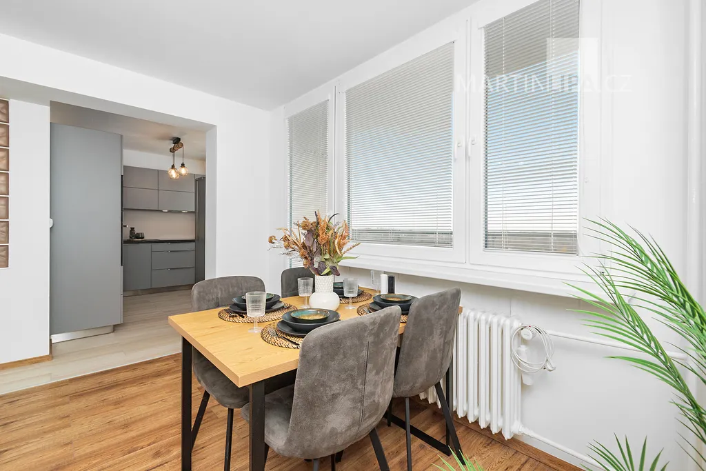 Jsme v Poděbradech, v bytě 3+1 o užitné ploše přes 86 metrů, s příslušenstvím dokonce 94. Po kompletní moderní rekonstrukci, v jedenáctém - předposledním - patře zatepleného panelového domu. V praxi to znamená: spousta světla, výhledy, ticho – a žádné starosti.