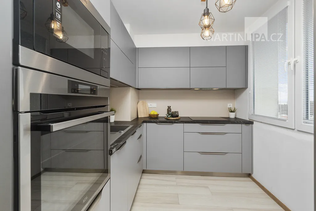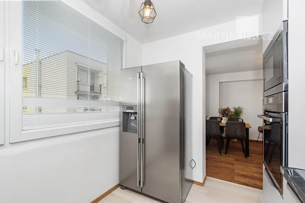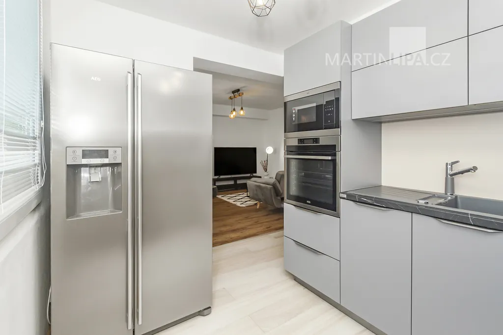 Přesuňme se rovnou do kuchyně. Ne malá, ne obří – tak akorát. Čisté linie, úložné prostory, vestavné spotřebiče AEG, indukce, mikrovlnka, trouba, a k tomu americká lednice s výrobníkem ledu. Velké okno poskytne světlo pro všechna vaše kulinářská kouzla – a když kouzlo selže, snadno vyvětráte.