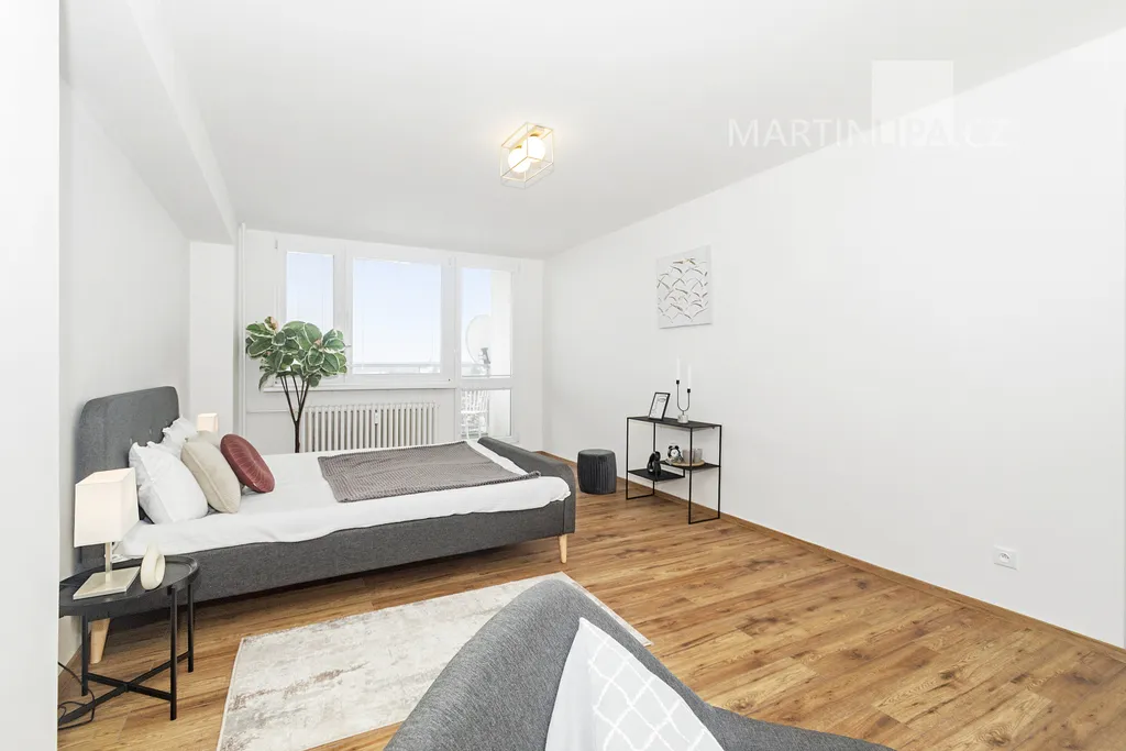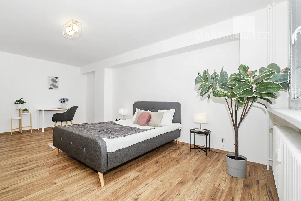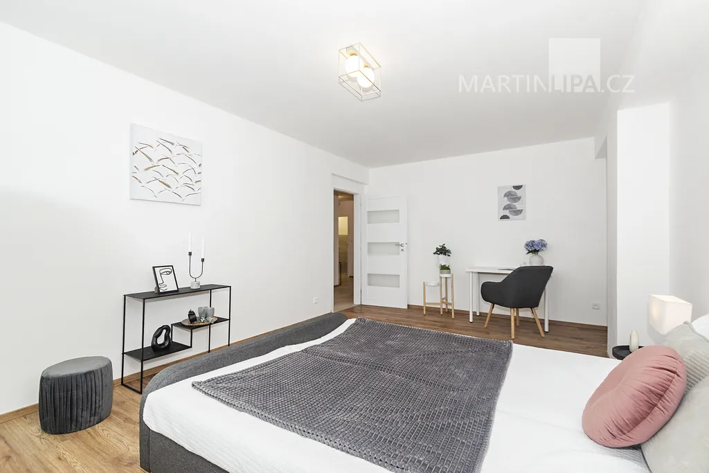 A teď do ložnice, kde rána začínají a večery končí. Na více než 22 metrech se sem vejde velká postel, skříň i pracovní stůl a pořád tu zůstane místo, aby místnost dýchala. Velká okna, vstup na lodžii. Místo, kde si člověk neukopne palec o postel a klidně si zacvičí jógu.