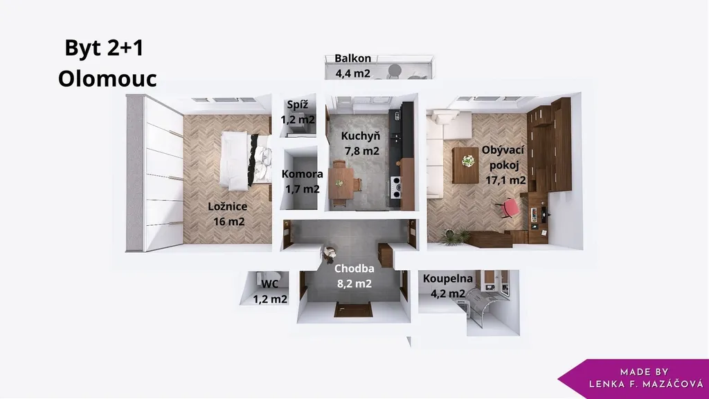 Kuchyně je plně vybavena a potěší každého, kdo má rád vaření. K dispozici je kvalitní trouba s plynovými hořáky, vestavěná myčka, jídelní stůl se čtyřmi židlemi a praktická spíž s policemi. Lednice je chytře ukrytá právě ve spíži, takže kuchyň působí čistým a elegantním dojmem. Obývací pokoj nabízí komfortní koženou sedačku (pouze 2 roky stará) a nadčasový nábytek na míru. Součástí je konferenční stolek a promyšlená obývací stěna, která kombinuje knihovnu, úložné prostory i pracovní kout s psacím stolem. V ložnici najdete velkou vestavěnou skříň, pohodlnou postel a také samostatnou šatnu – výborné místo pro organizaci oblečení, sportovních věcí i sezónních doplňků. Už při vstupu Vás uvítá prostorná chodba – skutečné srdce bytu, ze které jsou samostatné vstupy do všech neprůchozích místností. Koupelna je vybavena sprchovým koutem, umyvadlem se skříňkou a pračkou s horním plněním. WC je samostatné. Z kuchyně je vstup na balkon o ploše 4,5 m², kde si můžete vychutnat ranní kávu nebo večerní posezení.