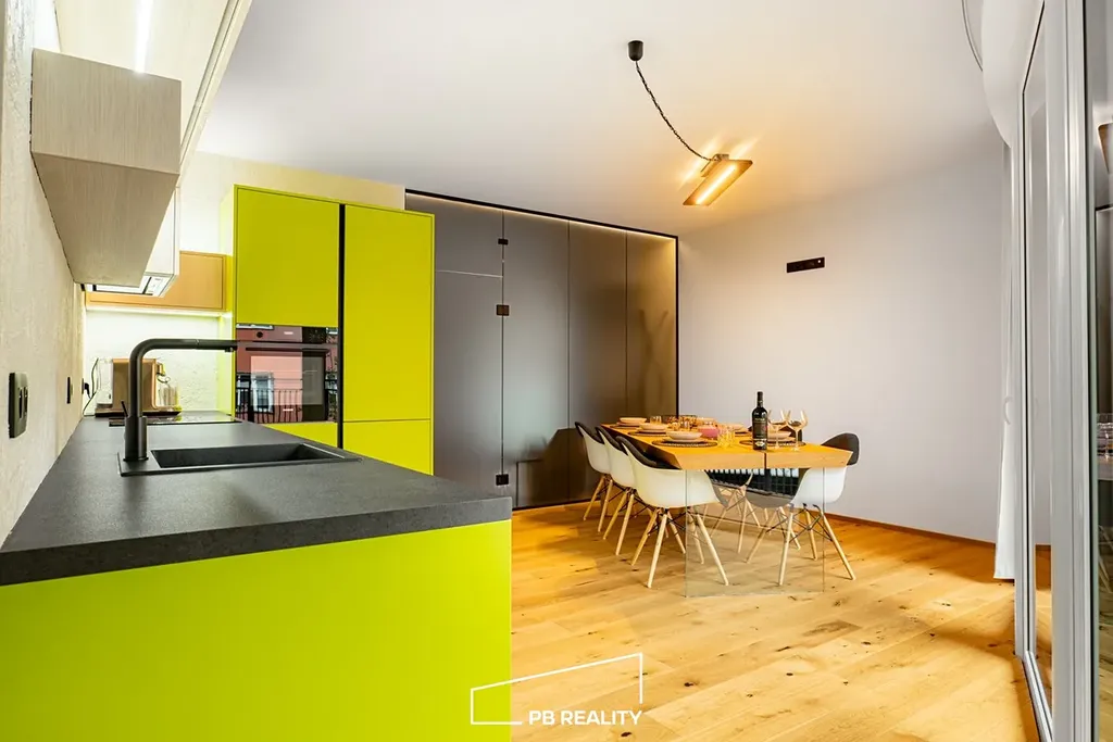 Dřevěná podlaha, podsvícená kuchyňská linka včetně spotřebičů v minimální hodnotě 300 000,-Kč s italskou stěrkou Travertino Romano, prostorná koupelna též kompletně v italské stěrce Travertino Romano s vanou a walk – in sprchou, na zakázku šité black-out závěsy v celém bytě, podsvícená skleněná příčka a zakázková skříňová sestava.