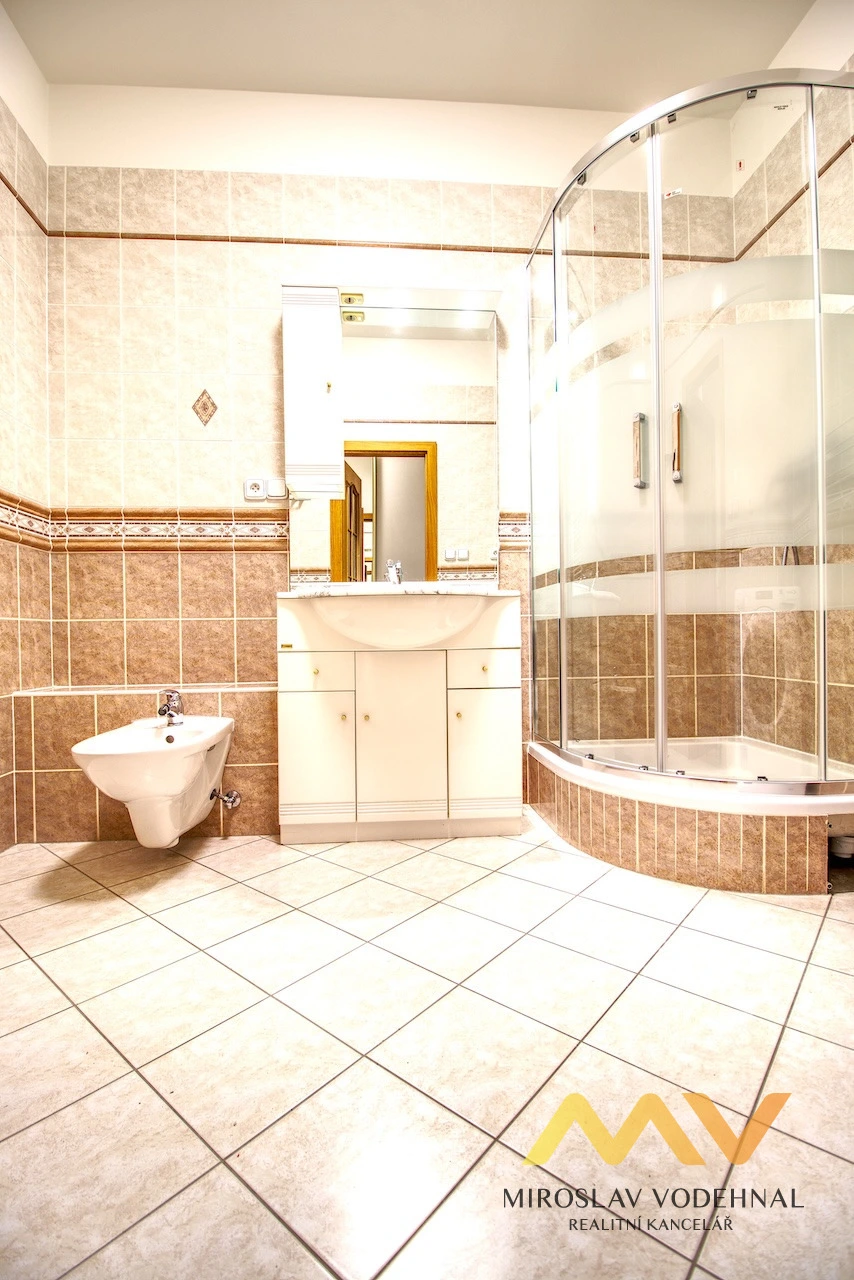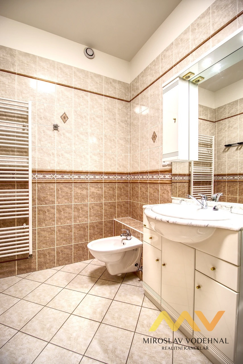 Koupelna je vybavena sprchovým koutem, umyvadlem s koupelnovou skříňkou a zrcadlem, bidetem a pračkou. Samostatné WC s umyvadlem je umístěno vedle koupelny. Vytápění bytu je centrální plynové (vlastní kotel). Byt má plastová okna se žaluziemi a podlahy pokrývá dlažba a laminátová podlaha.