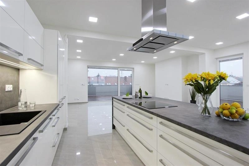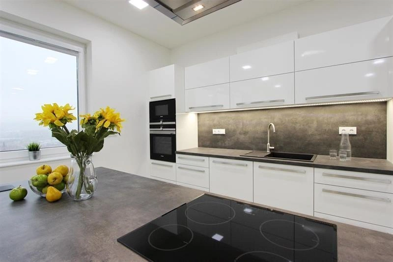 Moderní bílá kuchyňská linka s antracitovou pracovní deskou je vybavená veškerými vestavnými spotřebiči - sklokeramická varná deska, horkovzdušná trouba, mikrovlnná trouba, digestoř, myčka nádobí, lednice a mraznička.