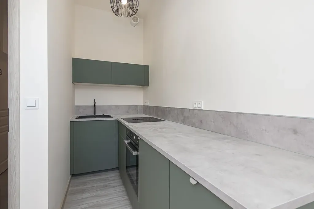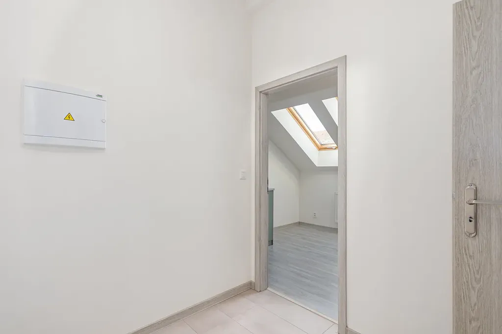 Po vstupu do bytu vás přivítá prostorná chodba s přímým vstupem do koupelny. Následuje obývací část s kuchyňským koutem, vybaveným novou kuchyňskou linkou a vestavěnými spotřebiči: myčkou, lednicí s mrazákem, troubou a indukční varnou deskou.
