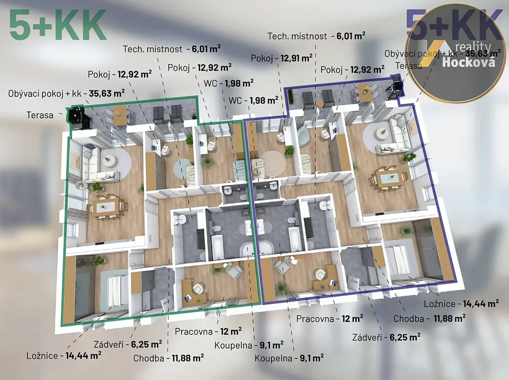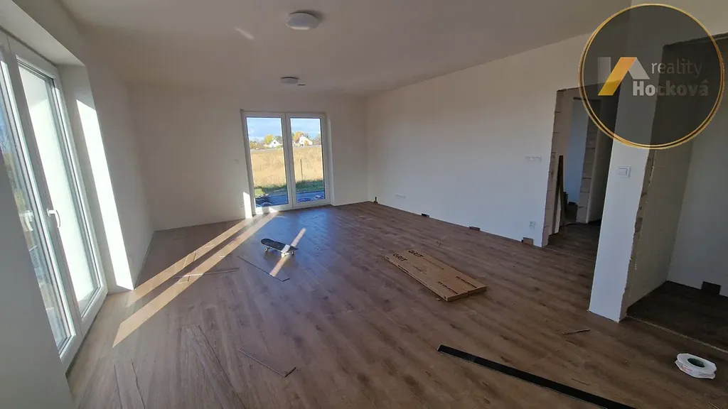 Nabízíme k pronájmu bytovou jednotku 5+kk (označenou jako levá část č. 1) v moderním bungalovu o užitné ploše 123 m² s pozemkem 415 m².