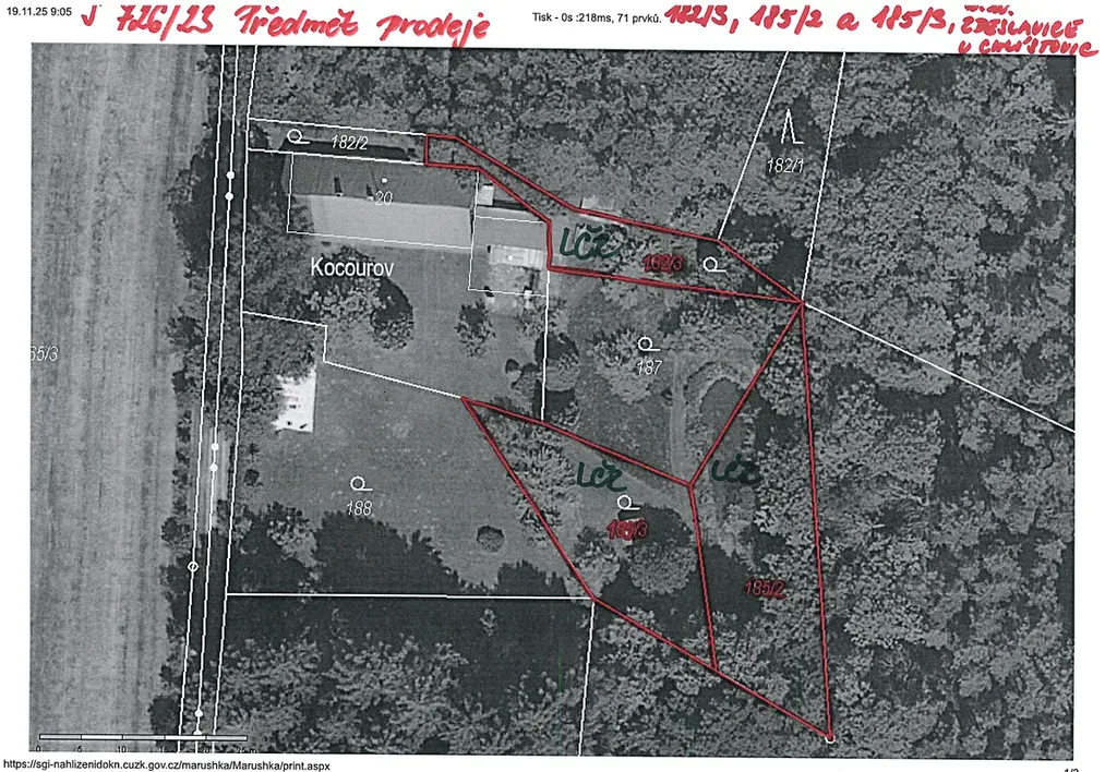 3 parcely p. č. 182/3, 185/2 a 185/3, vše k. ú. Zdeslavice u Chlístovic, o celkové výměře 1161 m2 bezprostředně navazující na okolí bývalé hájovny Kocourov (rodinný dům Zdeslavice č. p. 10 ve vlastnictví fyzické osoby) spadající pod obec Chlístovice, okres Kutná Hora: p. č. 182/3 o výměře 204 m2 druhem pozemku: zahrada; p. č. 185/2 o výměře 541 m2 druhem pozemku ostatní plocha se způsobem využití zamokřená plocha; p. č. 185/3 o výměře 416 m2 druhem pozemku zahrada. Pozemky nejsou oploceny, nachází se cca 1 km východně od zastavěného území osady Všesoky, klidná lokalita. Na předmětu prodeje se nachází část zamokřené plochy - tůň.