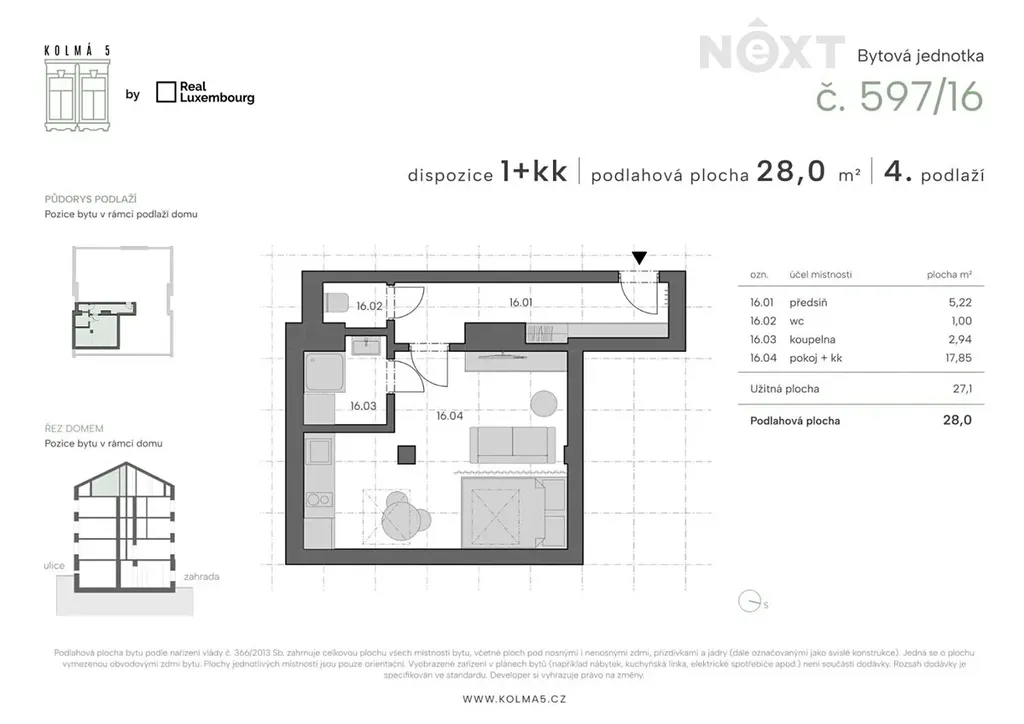 Tato konkrétní jednotka č.16 o dispozici 1kk a podlahové ploše 28 m2 se nachází ve 4 nadzemním podlaží s výhledem do ulice. Je členěna na vstupní chodbu ze které je přístup na wc, a dále obývacího pokoje s kuchyňským koutem a vstupem do koupelny. Přesné rozložení místností si můžete prohlédnout na přiloženém půdorysu. Vytápění je řešeno elektrickými přímotopy a ohřev vody elektrickým bojlerem.