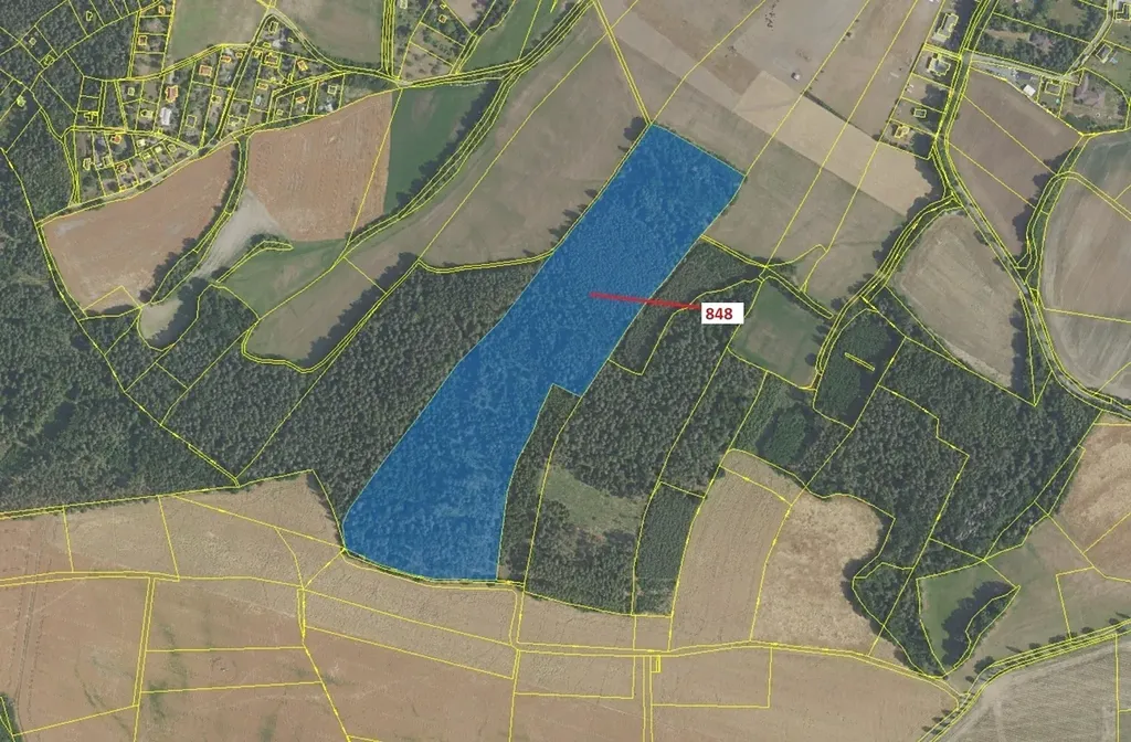 Lesní pozemek o výměře 81 658 m2, parcelní číslo 848, podíl 1/1, katastrální území Krámy, obec Nové Dvory, obec s rozšířenou působností Dobříš, okres Příbram, Středočeský kraj. Částečně po těžbě.