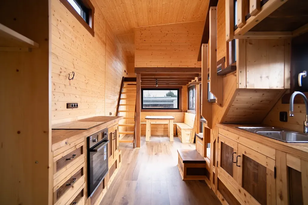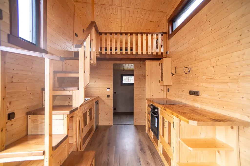 Prodám krásný a precizně postavený Tiny House o rozměrech 9,14 × 2,93 × 4,68 m.