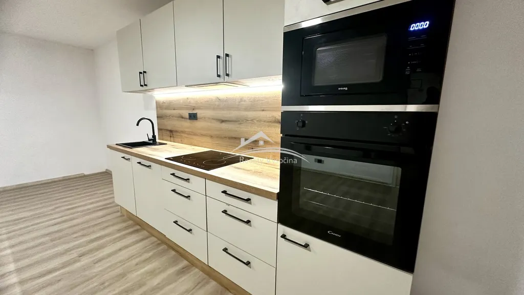 Byt je nově zařízený a nabízí velice pěkné a komfortní prvky: Podlahové vytápění, vinylovou podlahu, okna 3-skla, vybavenou kuchyňskou linku s indukční deskou, vestavěnou elektrickou troubou, mikrovlnou troubou a myčkou na nádobí a velice pěkný granitový dřez s designovou baterií.