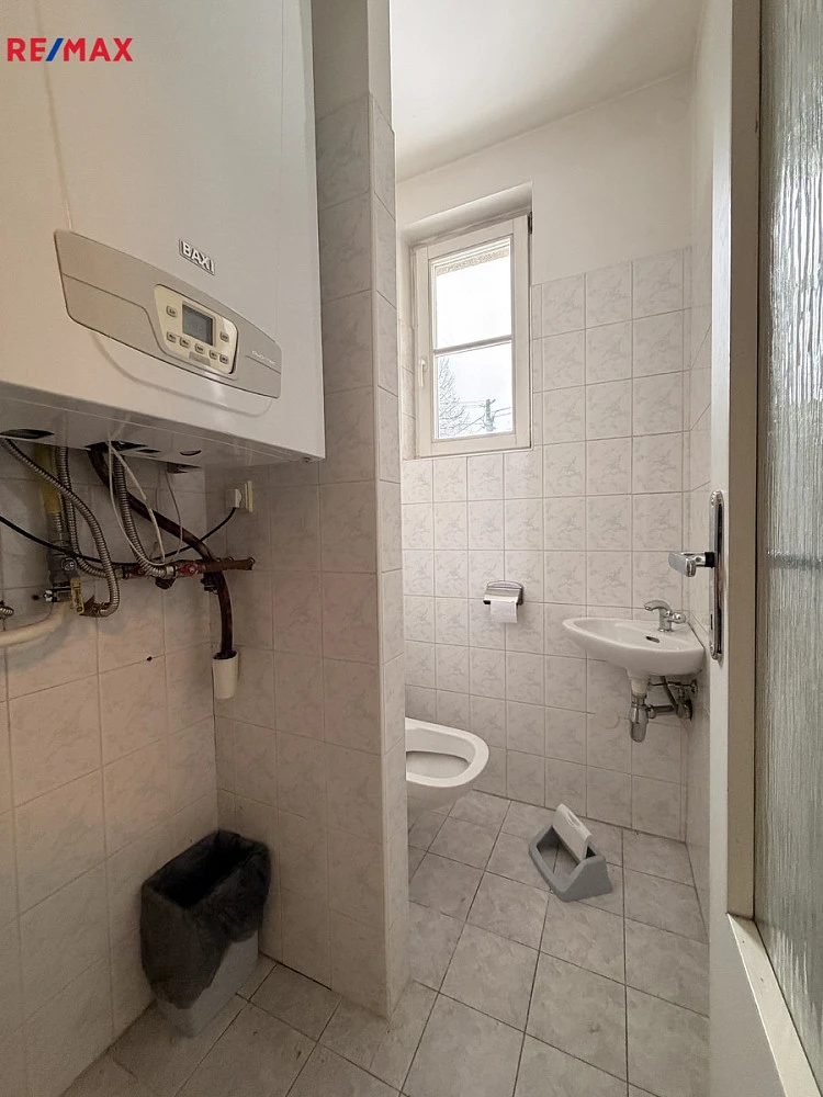 Vstup do domu je ze strany příjezdu přes zádveří s komorou do předsíně. Z chodby jsou pak přístupny tři pokoje (kanceláře), dále kuchyně s jídelnou, WC s umývátkem (na WC je umístěn i plynový kotel a