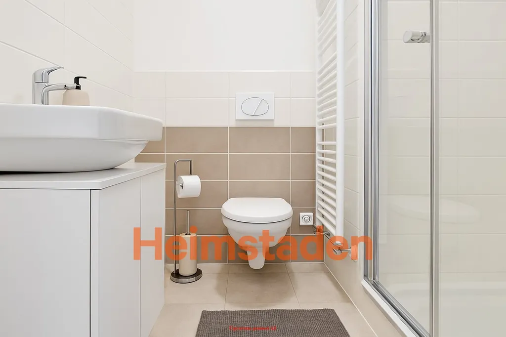 Součástí bytu je moderní kuchyňská linka s vestavnými spotřebiči – indukční deskou, troubou, mikrovlnnou troubou a kompaktní vestavnou lednicí. Kuchyň nabízí vše potřebné pro pohodlné vaření. Koupelna je řešena prakticky, je vybavena sprchovým koutem a poskytuje dostatek prostoru i pro každodenní rutinu.