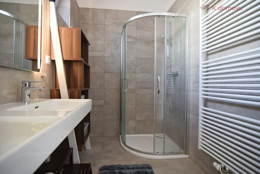 Vybavení: kuchyňská linka (indukční varná deska, horkovzdušná trouba, parní trouba, lednice, myčka (Siemens). Vestavěné skříně v zádveří a vestavěné skříně v ložnici. Náklady na bydlení jsou cca 5000 Kč/měsíc při třech osobách.