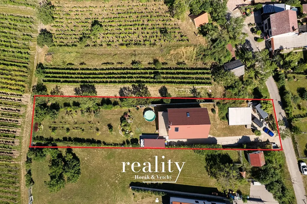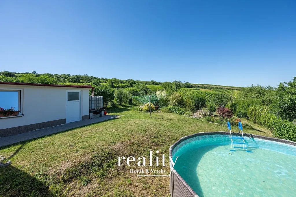 Zahrada je pečlivě udržovaná a přirozeně navazuje na okolní krajinu. Najdete zde ovocné stromy, mandloně, ořešáky a také dvě řady vinné révy, které dotvářejí autentický jihomoravský charakter pozemku. Za terasou, v horní části zahrady, je umístěn nadzemní kulatý bazén – ideální pro letní osvěžení s krásným výhledem.