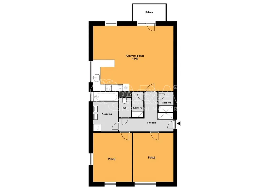 Dispozice: 2 samostatné ložnice (11,79 a 11,14 m2), kuchyň s jídelnou a obývacím pokojem (31,43 m2), koupelna s vanou a pračkou, samostatná toaleta, dvě komory s vestavěnými skříněmi, komora na chodbě vedle bytu (3,87 m2) a balkón (3,57 m2)
