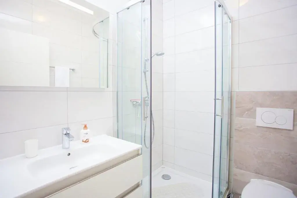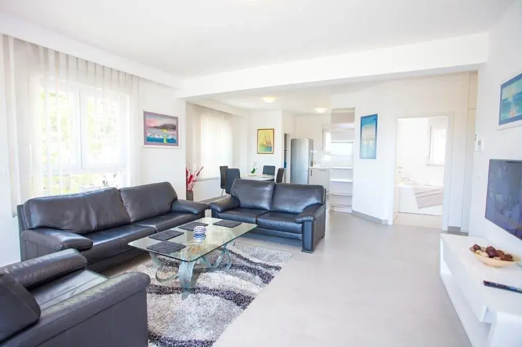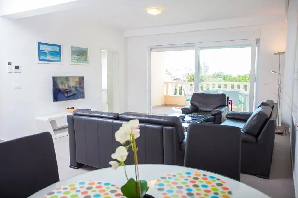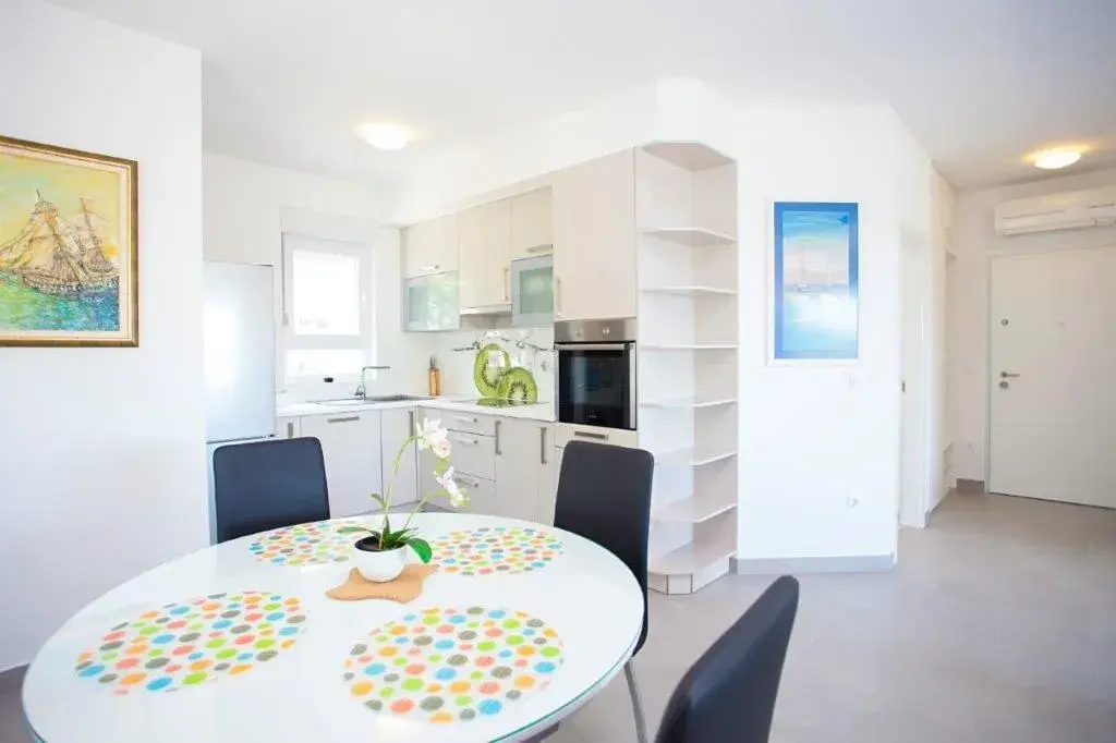 Apartmán o ploše 77,55 m2 se nachází ve druhém podlaží nově postavené čtyřpodlažní budovy s výtahem a sestává z technické místnosti, dvou ložnic, dvou koupelen, obývacího pokoje s kuchyní a jídelnou s přístupem na prostornou terasu o rozloze 12,50 m2 orientovanou na jih s krásným výhledem na moře a ostrovy. Apartmán je kompletně zařízený kvalitním nábytkem, kamennou a keramickou dlažbou, plně vybavenými koupelnami, klimatizací, podlahovým vytápěním v celém apartmánu, má bezpečnostní vstupní dveře, nerezové zábradlí, satelitní TV, internetové připojení, Budova má kvalitní tepelnou a zvukovou izolaci, Při stavbě a interiérovém provedení byly použity nejkvalitnější materiály. K apartmánu náleží jedno venkovní parkovací stání.