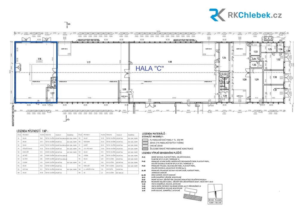• propojení s vedlejší halou „C“ přes dvoukřídlé dveře 2,5 × 2,5 m